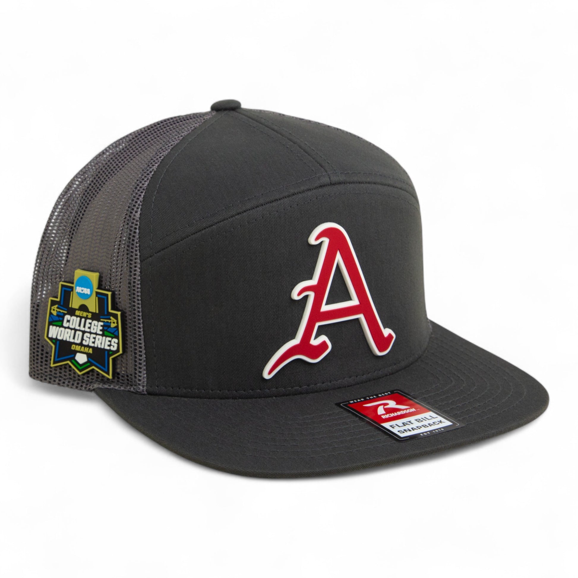 Arkansas Razorbacks Baseball Script A 2025 College World Series 3D Snapback Seven-Panel Flat Bill Trucker Hat- Charcoal