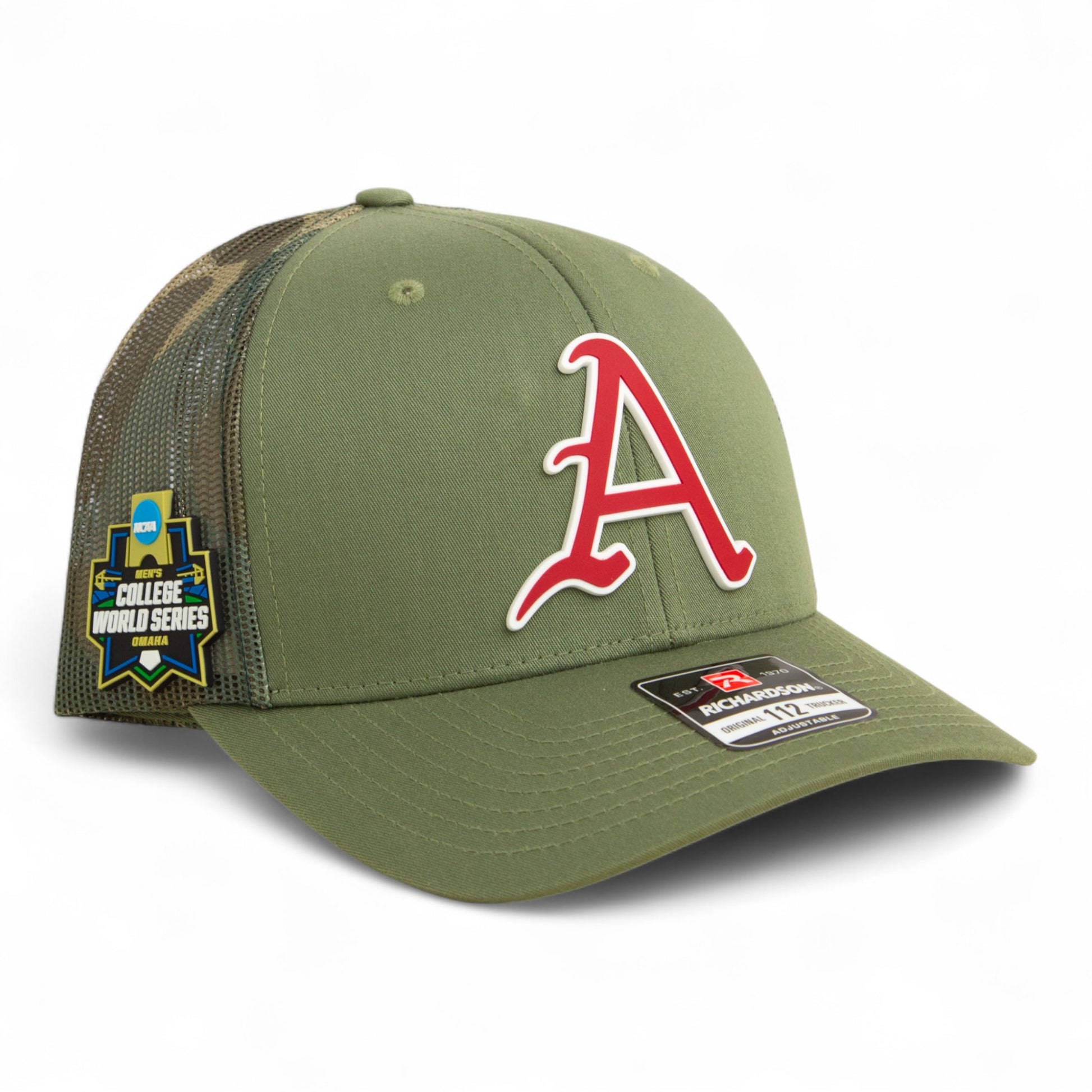 Arkansas Razorbacks Baseball Script A 2025 College World Series 3D Snapback Trucker Hat- Loden/ Green Camo