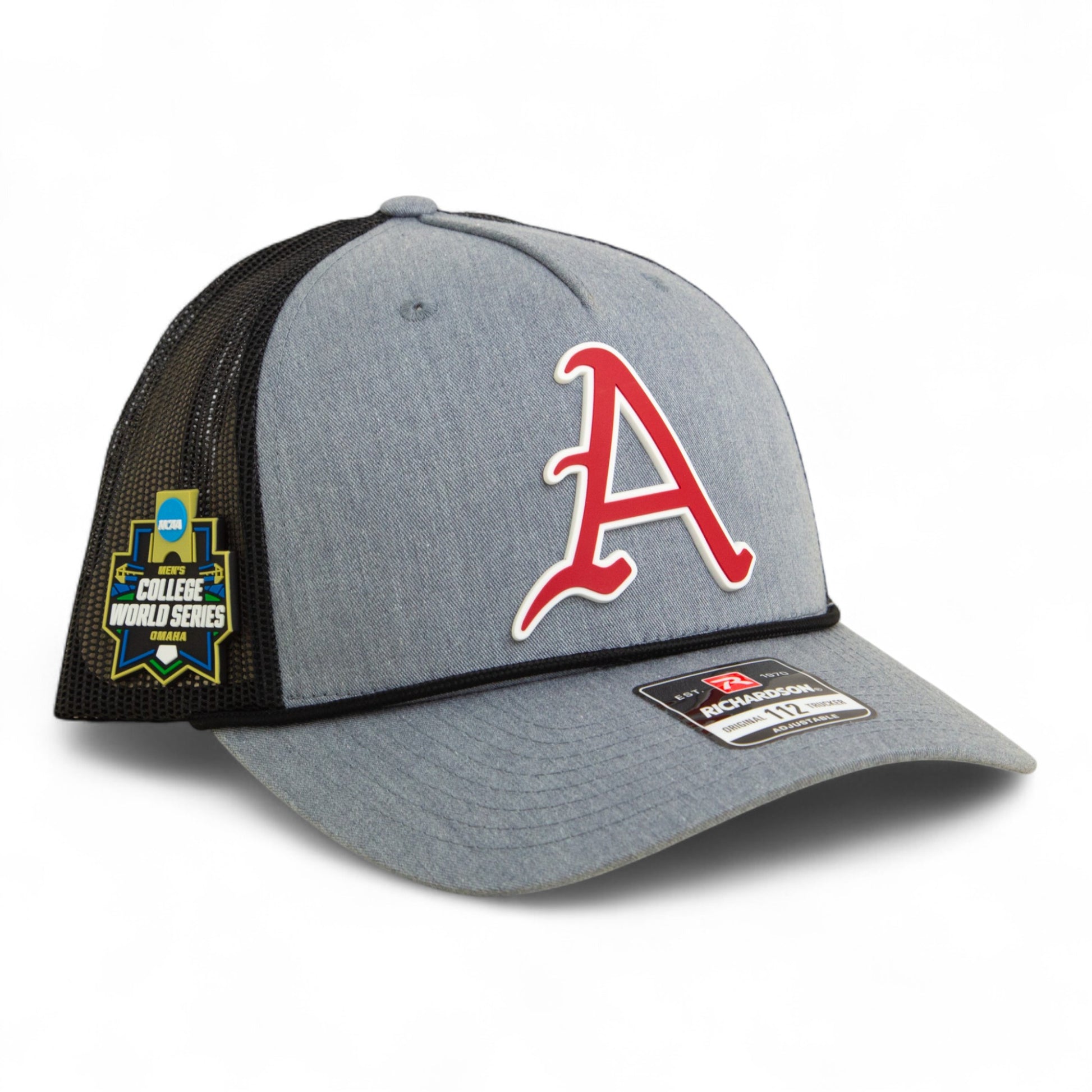 Arkansas Razorbacks Baseball Script A 2025 College World Series 3D Snapback Trucker Rope Hat- Heather Grey/ Black