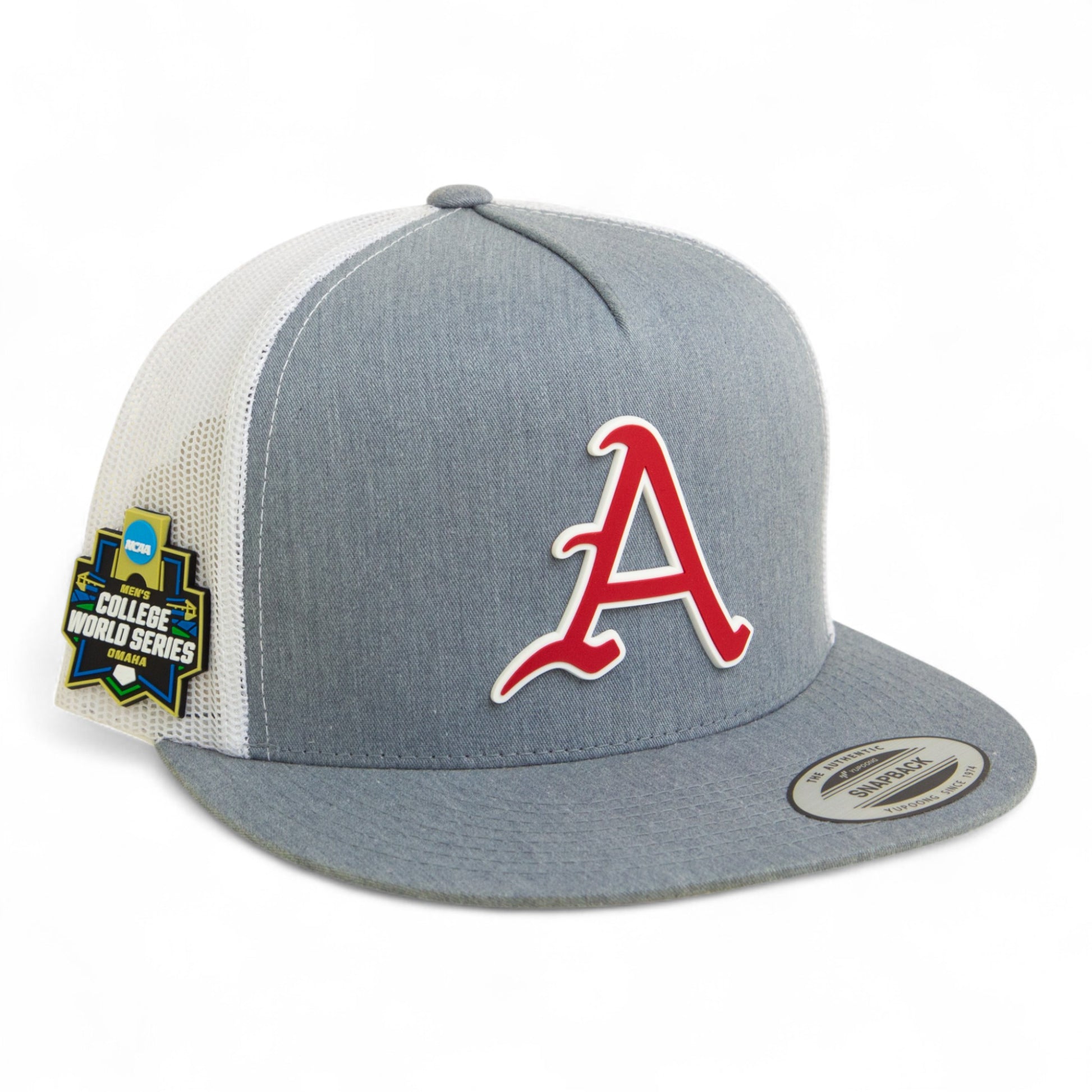 Arkansas Razorbacks Baseball Script A 2025 College World Series 3D YP Snapback Flat Bill Trucker Hat- Heather Grey/ White