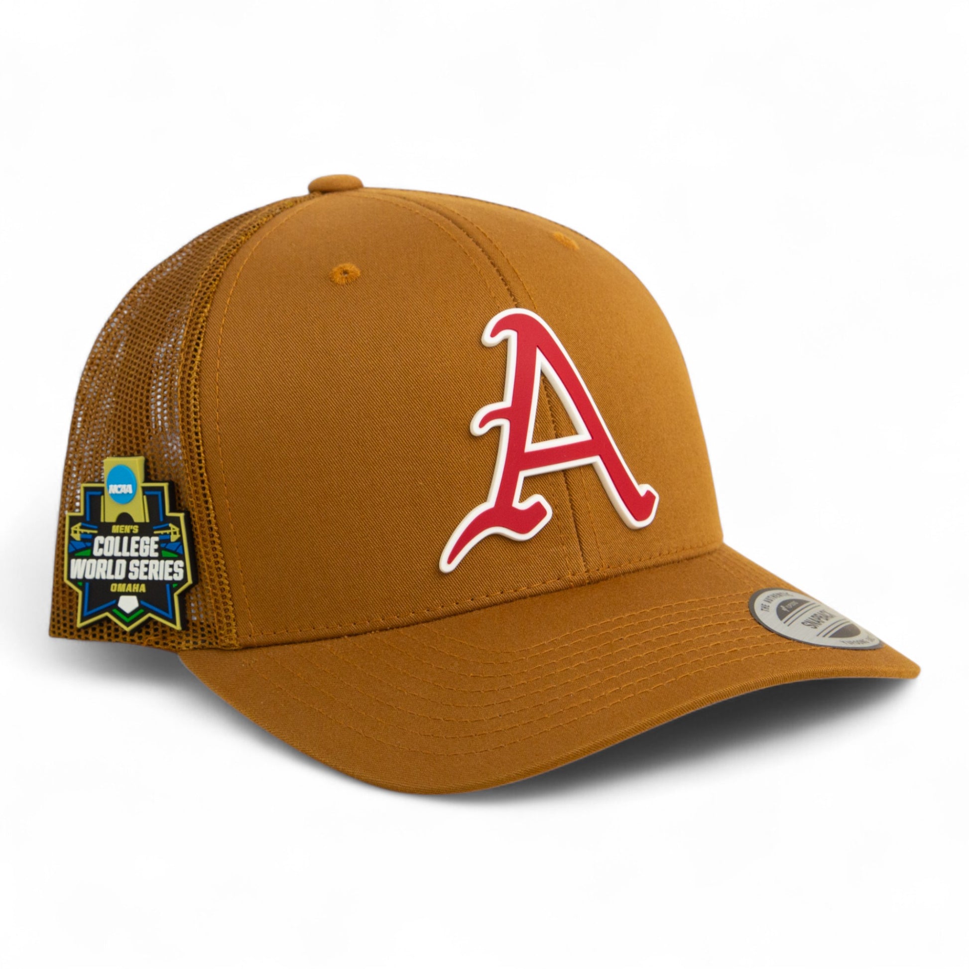 Arkansas Razorbacks Baseball Script A 2025 College World Series 3D YP Snapback Trucker Hat- Caramel