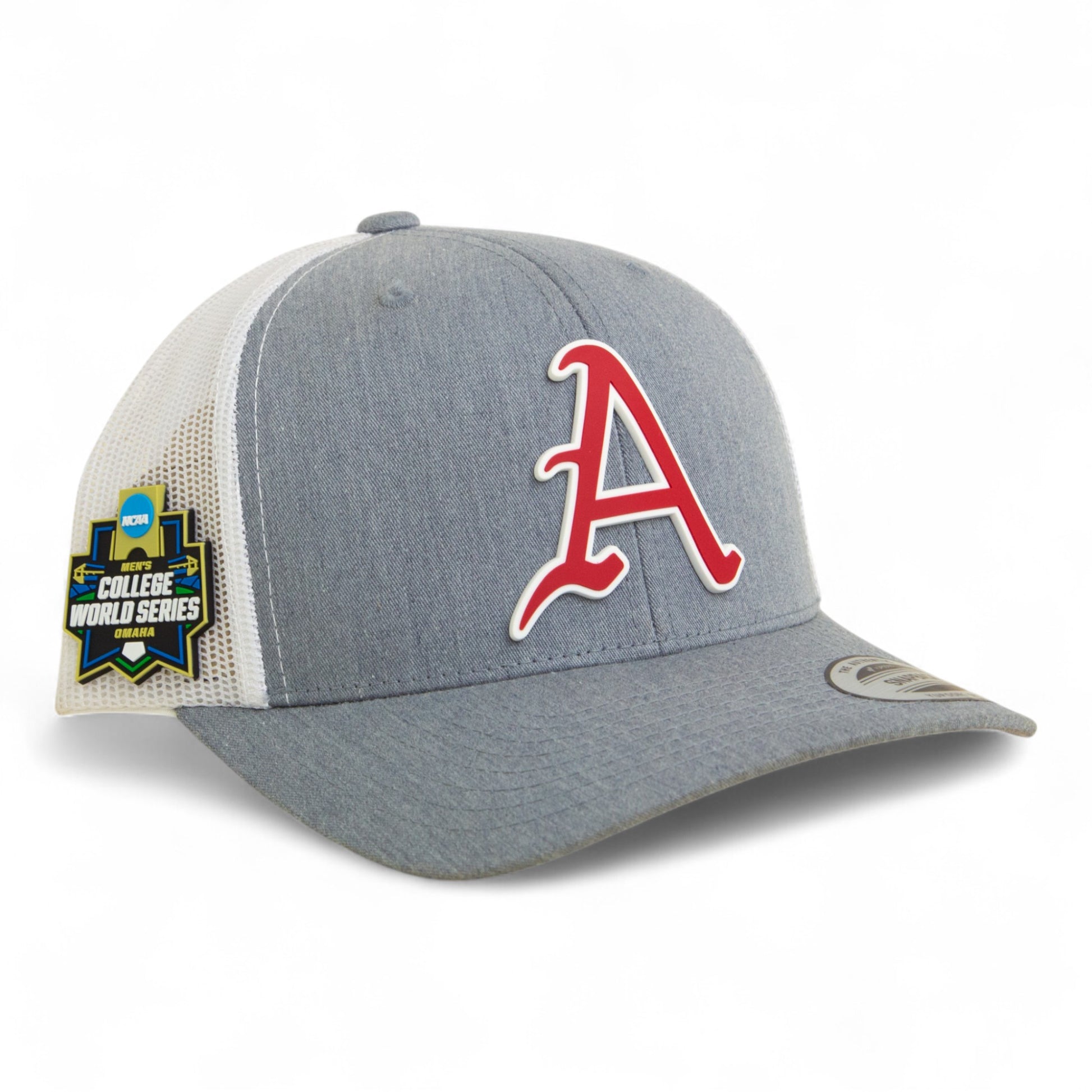 Arkansas Razorbacks Baseball Script A 2025 College World Series 3D YP Snapback Trucker Hat- Heather Grey/ White