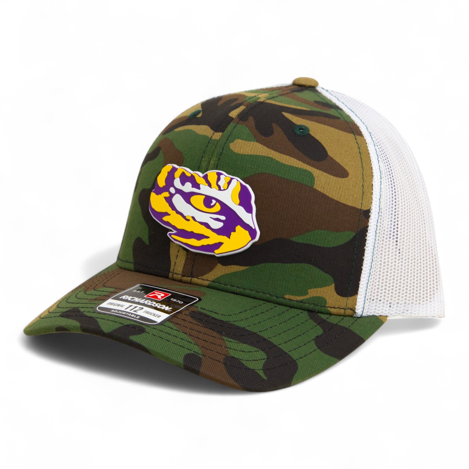 LSU Tiger Eye 3D Snapback Trucker Hat- Army Camo/ White
