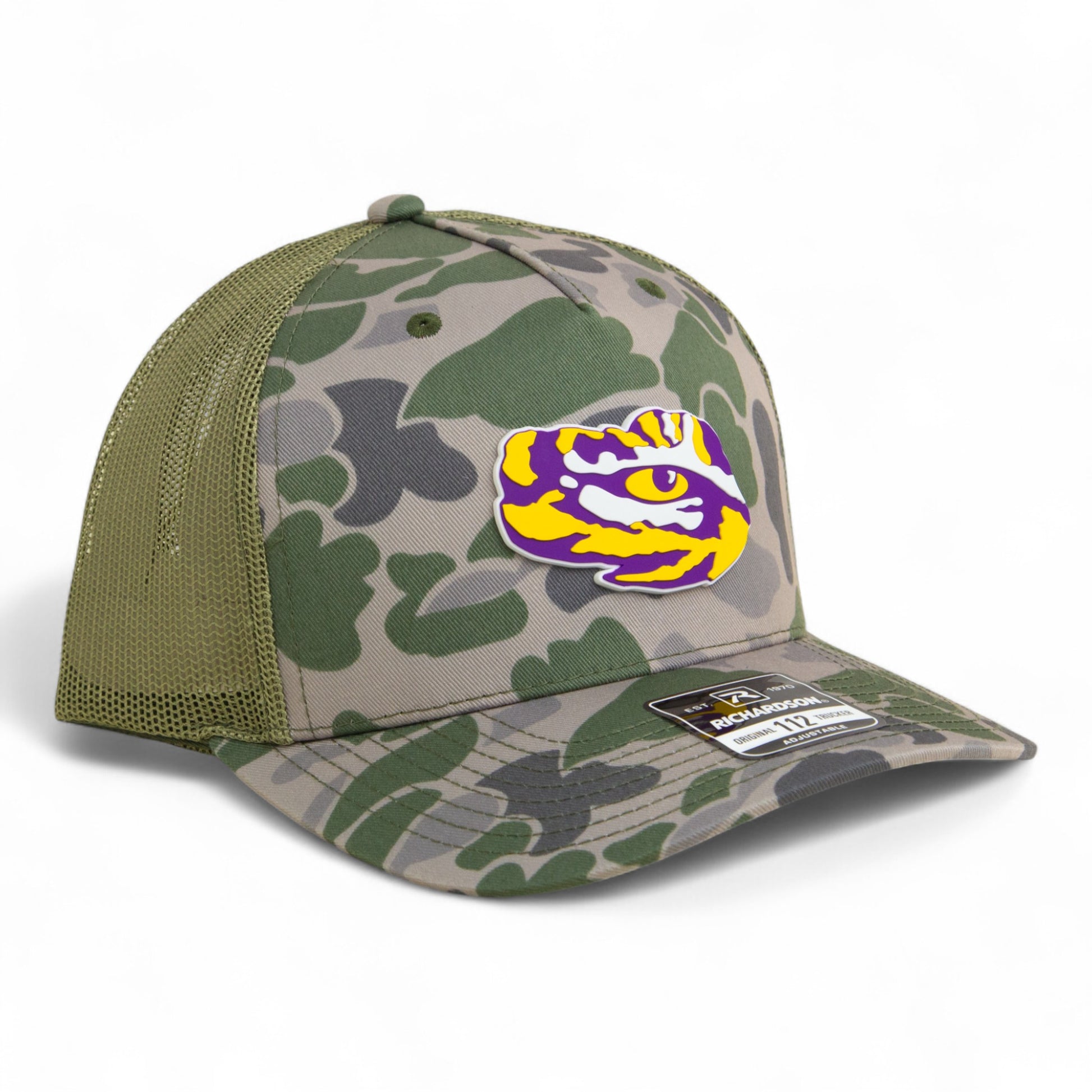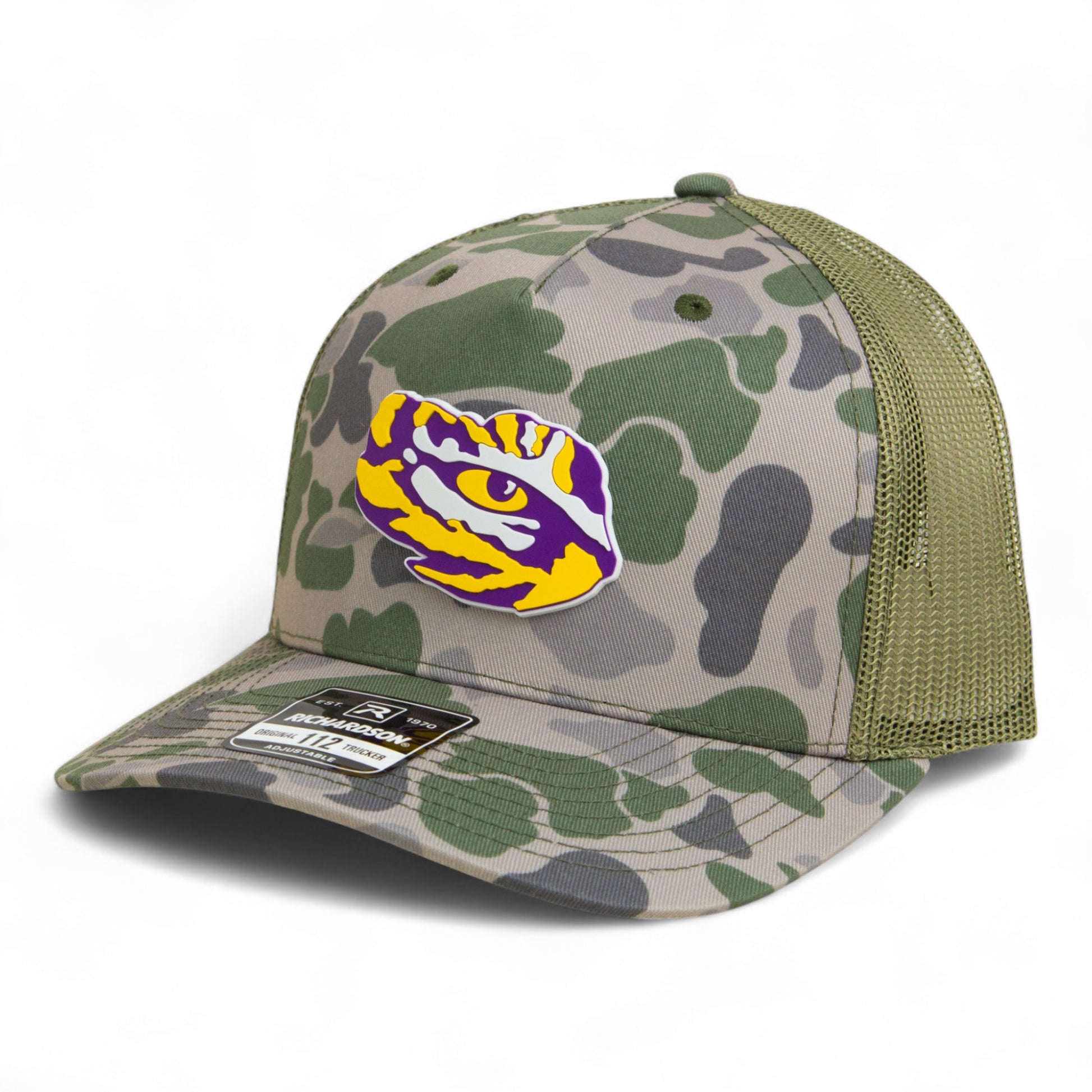 LSU Tiger Eye 3D Snapback Trucker Hat- Marsh Duck Camo/ Loden